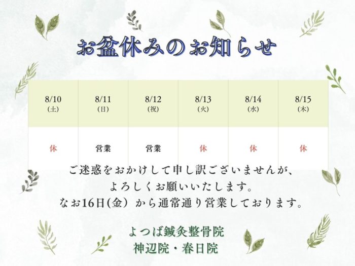 HOME > 新着情報 > 新着情報年末年始の営業時間のお知らせ 2025年9月8日 こんにちはよつば鍼灸整骨院です。の営業時間のお知らせです。ご症状やお悩みなどある場合、お早めにご相談ください。 -新着情報